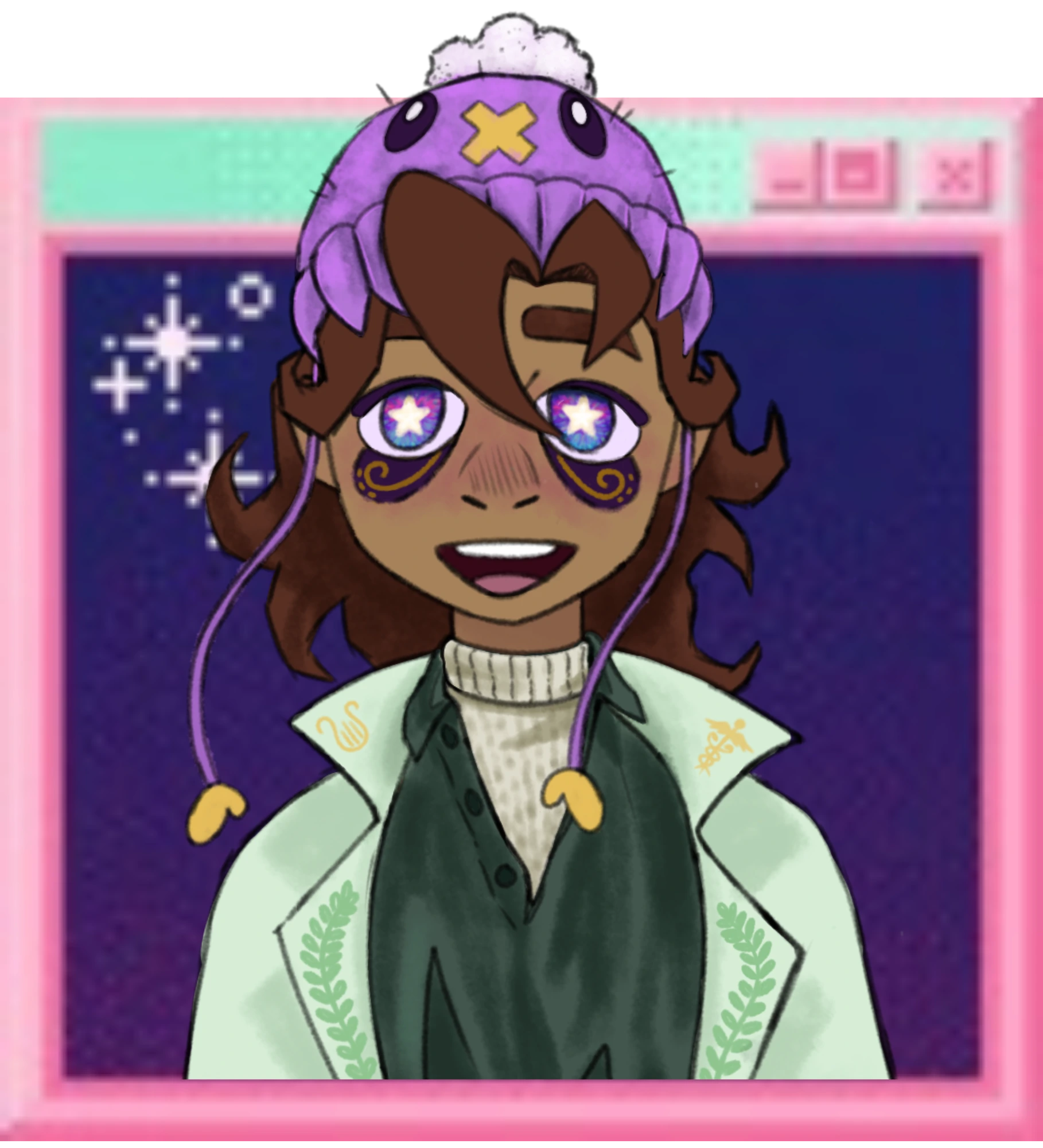 Completed welcome/intro box - Changed profile picture to be inside of a cool web graphic instead of a circle, it looks SO much better. Added tamoNOTchis and a website button I drew up and animated in Aseprite.