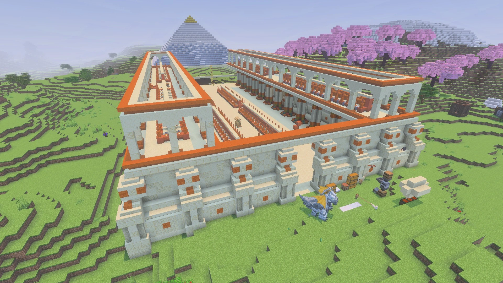 I have the main structure done, I just need an interior for the pyramiod in the back as well as some plants and docor inside the main courtyard, along with actually filling the place up with villagers, of course.